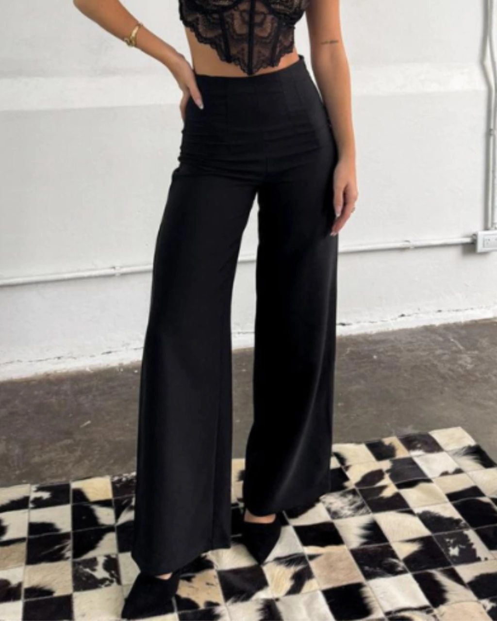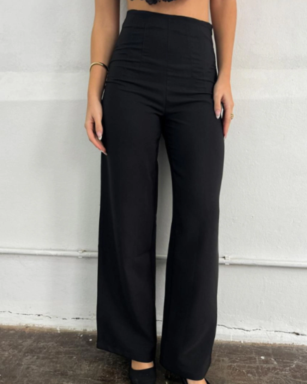 Wide leg con detalle de pinzas en cintura y cierre invisible en lateral.