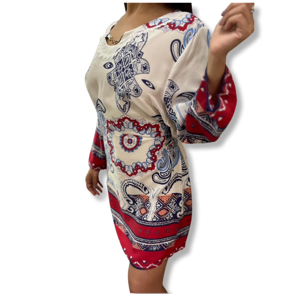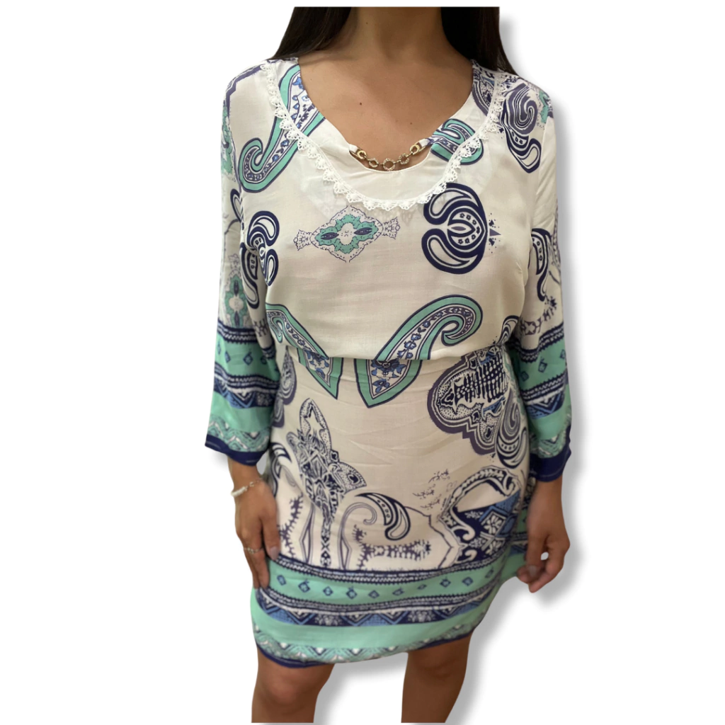 Vestido estampado con detalle de cadena en escote.